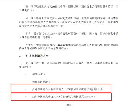 根據(jù)招股書,公司要求可申請人士為年滿18周歲,擁有香港地址,境外的非美籍人士及非中國內(nèi)地法人及自然人,合資格境內(nèi)機(jī)構(gòu)投資者除外。