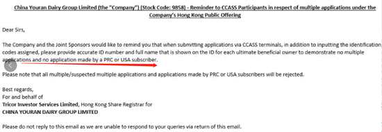 昨日,據(jù)卓佳證券登記有限公司,申請紀(jì)錄需附上申請人姓名及身份證號,如發(fā)現(xiàn)是內(nèi)地和美國人,會拒絕有關(guān)申請,請客戶注意,此事更是在招股書中明顯寫著的。