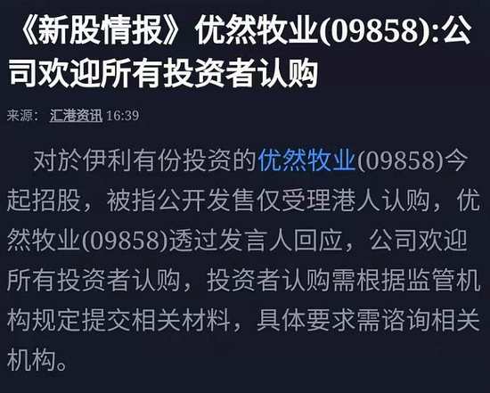 優(yōu)然牧業(yè)(09858)稱歡迎所有投資者認(rèn)購 招股書顯示境內(nèi)自然人不可申購