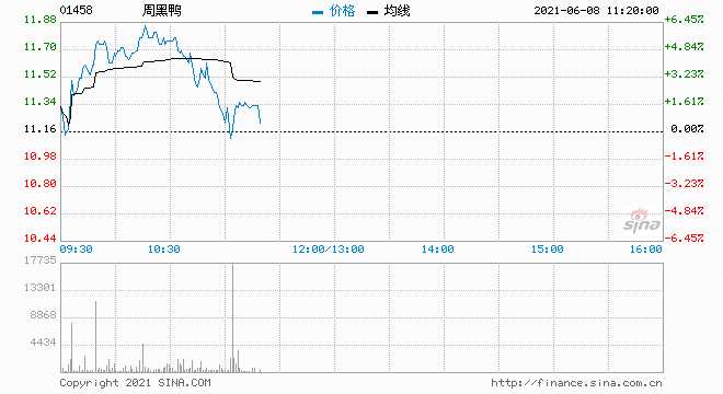 周黑鴨(1458.HK)股價繼續(xù)走強(qiáng),盤中最高見11.86港元,再創(chuàng)新高,現(xiàn)報11.3港元,漲幅1.25%,最新總市值269.29億港元。