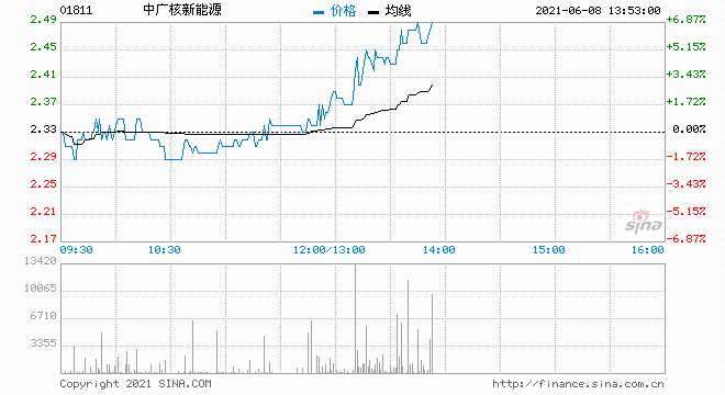 摘要: 中廣核新能源(1811.HK)股價(jià)繼續(xù)拉升,現(xiàn)報(bào)2.48港元,漲幅6.44%,最新總市值106.41億港元,近兩個(gè)交易日累計(jì)上漲13.7%。公司7日公告稱,2021年5月集團(tuán)按合并報(bào)表口徑完成發(fā)電量1