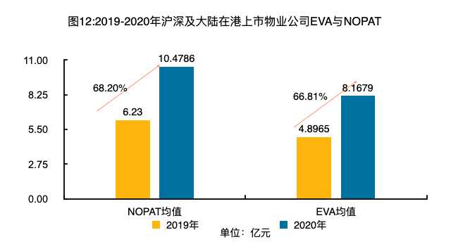 2020年,物業(yè)上市公司加強(qiáng)內(nèi)部管控優(yōu)化,提升企業(yè)運(yùn)營(yíng)效率,多措并舉降低資金成本,企業(yè)的經(jīng)濟(jì)增加值(EVA)大幅提升,2020年,上市物業(yè)企業(yè)EVA均值同比增長(zhǎng)66.81%至8.17億元;近兩年上市物業(yè)公司NOPAT均值分別為6.23億元、10.48億元,同比增長(zhǎng)68.20%。