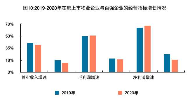 2020年,在港物業(yè)服務(wù)上市公司的營(yíng)業(yè)收入均值、毛利潤(rùn)均值、凈利潤(rùn)均值分別為30.6億元、8.8億元、4.6億元,同比增速分別為43.1%、53.4%、64.6%。而作為參考,2020年,百?gòu)?qiáng)企業(yè)的營(yíng)業(yè)收入均值、毛利潤(rùn)均值、凈利潤(rùn)均值分別為11.7億元、2.9億元、1.0億元,同比增速分別為12.81%、15.15%、14.73%。在港上市公司在各項(xiàng)指標(biāo)均值處于較大基數(shù)的前提下,仍能達(dá)到如此高的增速,凸顯了強(qiáng)大的成長(zhǎng)性優(yōu)勢(shì)。