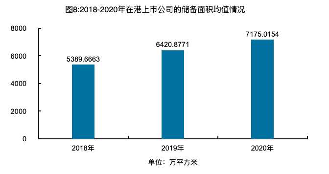 2020年,在港上市物業(yè)企業(yè)的儲(chǔ)備面積均值為7175.0萬(wàn)平方米,同比增長(zhǎng)11.8%,占在管面積均值的66.1%,且近三年一直處于增長(zhǎng)狀態(tài)。