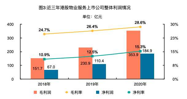 數(shù)據(jù)顯示,2020年,港股上市的40家物業(yè)服務(wù)企業(yè)營(yíng)業(yè)收入合計(jì)達(dá)1222億元,首次突破千億大關(guān),同比增長(zhǎng)39.8%,營(yíng)業(yè)收入均值30.6億元,較上年增加8.7億元;毛利潤(rùn)353.9億元,同比增長(zhǎng)53.2%,凈利潤(rùn)184.9億元,同比大漲67.6%。