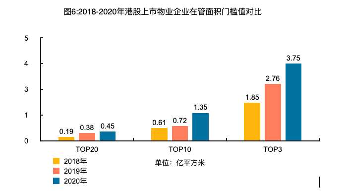 2020年港股物業(yè)服務(wù)上市公司TOP3企業(yè)在管面積門檻值達(dá)3.75億平方米,較2019年提升了0.99億平方米,增幅約為35.7%;TOP10企業(yè)在管面積門檻值為1.35億平方米,較2019年提升約0.63億平方米,增幅高達(dá)87.5%。