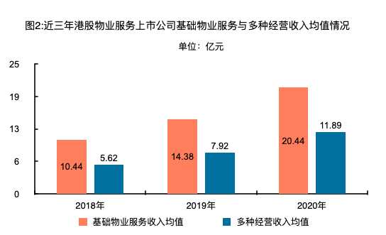 報(bào)告指出,從收入構(gòu)成看,多數(shù)物業(yè)服務(wù)上市公司收入主體仍然是基礎(chǔ)物業(yè)服務(wù),2020年40家港股上市公司基礎(chǔ)物業(yè)服務(wù)收入均值約20.4億元,同比增長(zhǎng)42.1%。隨著多種經(jīng)營(yíng)日益成為物業(yè)服務(wù)企業(yè)拓展利潤(rùn)空間的新賽道,多種經(jīng)營(yíng)收入持續(xù)增長(zhǎng),2020年港股物業(yè)服務(wù)上市公司多種經(jīng)營(yíng)收入均值11.9億元,同比增長(zhǎng)50.1%。