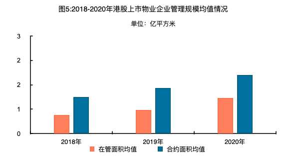 2020年,在港物業(yè)服務(wù)上市公司的在管面積均值為1.1億平方米,同比增速45.7%。與2019年的增速相比,2020年提升了15.2個(gè)百分點(diǎn),遠(yuǎn)超同期百?gòu)?qiáng)企業(yè)在管面積均值的增速,從合約面積看,在港物業(yè)服務(wù)上市公司2020年的合約面積均值為1.8億平方米,同比增長(zhǎng)率約28.6%。