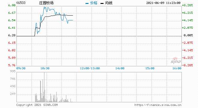 莊園牧場A股漲停報11.22元,股價突破年線創(chuàng)今年1月以來新高;H股一度漲超8%,目前收窄至5%以內(nèi),報6.56港元;莊園牧場(002910,股吧)最新市值24億人民幣。