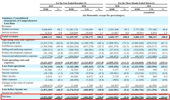 根據(jù)招股書,叮咚買菜2019年營收為38.8億元,2020年營收為113.36億元,2021年第一季度營收58.03億,同比大幅增加52.63%。