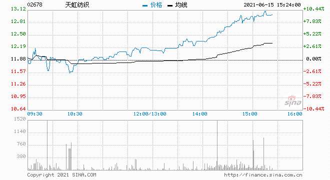 天虹紡織(2678.HK)午后漲幅擴(kuò)大至9.25%,報(bào)12.98港元,總市值119億港元。