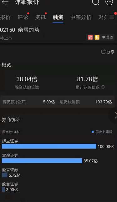截至上午11點35分,奈雪的茶孖展額193億港元,超購37倍,輝立證券孖展額超100億。