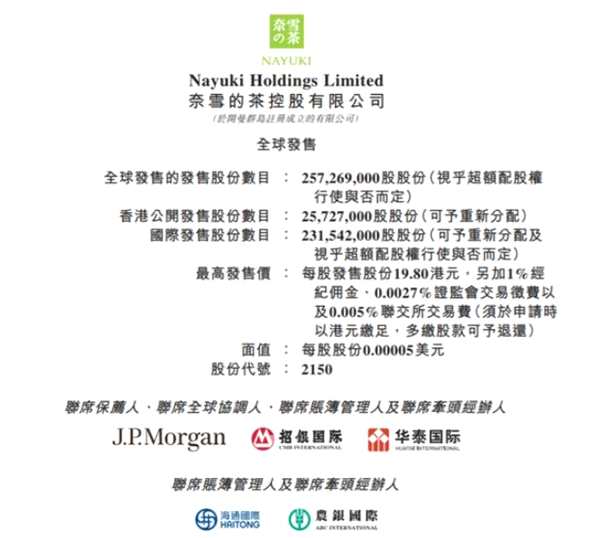 據(jù)媒體報(bào)道,奈雪的茶方面表示,本次招股時(shí)間為6月18日-23日,計(jì)劃全球發(fā)售的發(fā)售股份2.57億股,其中包括中國香港公開發(fā)售股份2573萬股,國際發(fā)售股份2.32億股,招股區(qū)間為每股17.20港元至19.80港元,預(yù)計(jì)將于6月30日在港交所掛牌上市,證券代碼為“2150”。