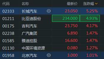 快訊:汽車股午后走高 長城汽車、比亞迪股份漲5%