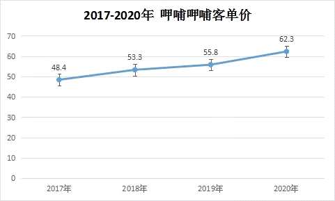據(jù)了解,從呷哺呷哺近四年的可客單價來看,呈逐年上漲的狀態(tài)。2017年-2020年,其客單價分別是48.4元、53.3元、55.8元、62.3元。