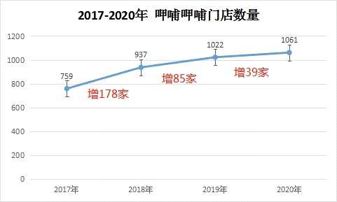 據(jù)了解,從呷哺呷哺近四年的擴(kuò)店數(shù)量來看,每年的擴(kuò)店差數(shù)越來越小,擴(kuò)店速度大幅降低。2017年-2020年,其門店數(shù)量分別為759家、937家、1022家、1061家。