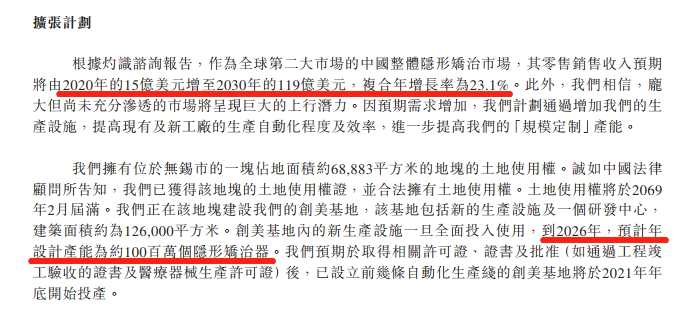IPO為時代天使募集了約25億港元。根據(jù)招股書,其中10億港元計劃投入到新的生產(chǎn)基地“創(chuàng)美基地”的建設(shè)。并且預(yù)計到2026年,年產(chǎn)能將達(dá)到1億個隱形矯治器。