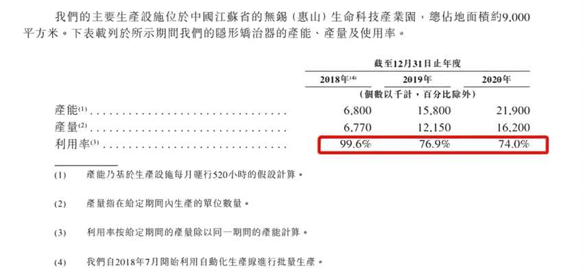 值得注意的是,時代天使的產(chǎn)能利用率也不高。目前,時代天使的產(chǎn)能主要位于江蘇無錫的生命科技產(chǎn)業(yè)園。據(jù)招股書,2018年、2019年、2020年的產(chǎn)能為680萬個、1580萬個和2190萬個,產(chǎn)能利用率分別為99.6%、76.9%和74%。