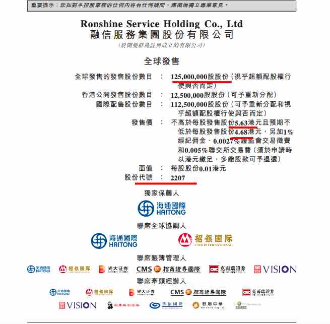 公告顯示,融信服務(wù)發(fā)售價區(qū)間為每股5.63港元-4.68港元(不包括1.0%經(jīng)紀傭金、0.0027%證監(jiān)會交易徵費及0.005%聯(lián)交所交易費)。每首1000股份,預計最低入場費4680港元。