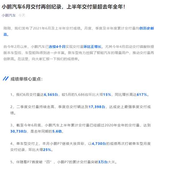 據(jù)“小鵬汽車”微信公眾號7月1日消息,小鵬汽車2021年第二季度交付17398輛,同比增長439%;6月交付6565輛,同比增長617%,創(chuàng)月度交付歷史新高。小鵬計劃在7月推出G3I SUV,計劃在今年9月交付。