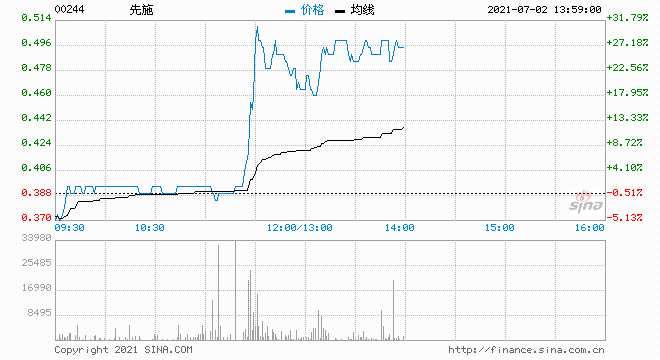 先施(0244.HK)復牌暴漲25.64%,報0.49港元,成交額放大至1565萬港元,總市值6.44億港元。