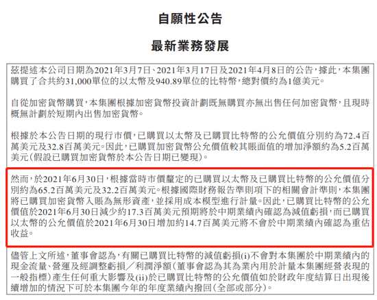 董事會認(rèn)為,有關(guān)已購買比特幣的減值虧損不會對集團(tuán)于中期業(yè)績內(nèi)的現(xiàn)金流量、營運(yùn)及經(jīng)調(diào)整虧損/利潤凈額產(chǎn)生任何重大影響,以及于已購買比特幣的公允價(jià)值,如于財(cái)政年度結(jié)算日出現(xiàn)后續(xù)增加的情況下,可于集團(tuán)今年的年度業(yè)績內(nèi)撥回(全部或部分)。
