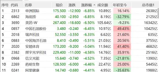 藍籌方面, 申洲國際、海底撈跌近7%,領(lǐng)跌藍籌,美團、中石油、瑞聲跌超6%,安踏、中海油跌超5%。
