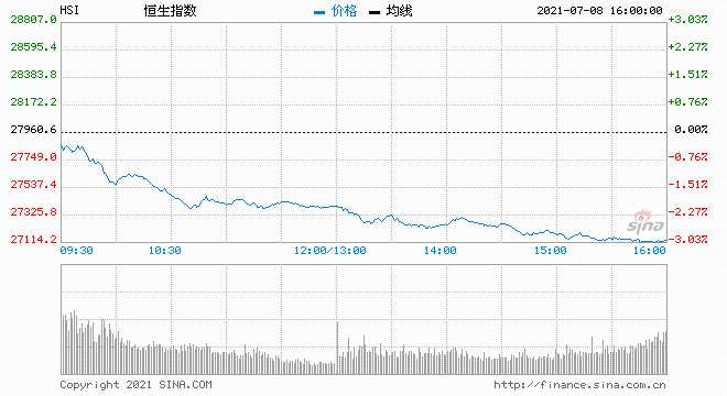 7月8日消息,監(jiān)管風險加劇,港股恒指大跌3%,恒生科指暴跌4%,新東方在線跌超7%,嗶哩嗶哩、比亞迪(002594,股吧)電子、美團、瑞聲跌超6%,百度跌超5%,阿里、騰訊跌超4%。