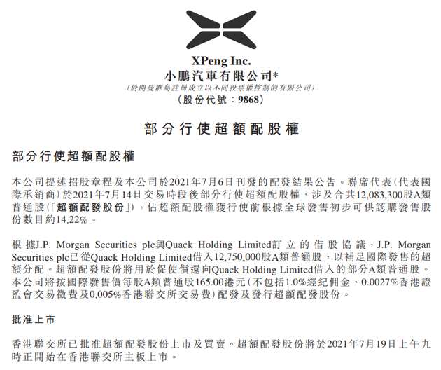 小鵬將按國際發(fā)售價每股A類普通股165.00港元配發(fā)及發(fā)行超額配發(fā)股份。超額配發(fā)股份將于2021年7月19日上午九時正開始在香港聯(lián)交所主板上市。