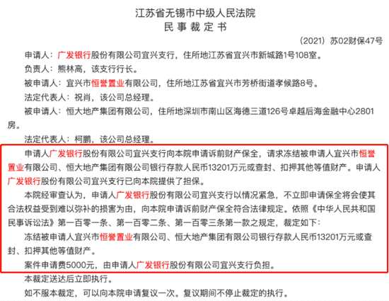 根據(jù)無錫市中級人民法院的民事裁定書顯示,廣發(fā)銀行近日請求凍結(jié)被申請人宜興市恒譽(yù)置業(yè)有限公司、恒大地產(chǎn)集團(tuán)有限公司銀行存款1.32億元,或查封、扣押其他等值財(cái)產(chǎn)。