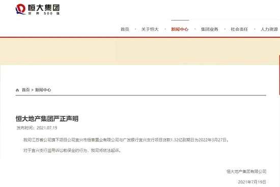 在當(dāng)日收盤前,恒大方面緊急發(fā)布聲明回應(yīng),“我司江蘇省公司旗下項(xiàng)目公司宜興市恒譽(yù)置業(yè)有限公司與廣發(fā)銀行宜興支行項(xiàng)目貸款1.32億元到期日為2022年3月27日。對于宜興支行濫用訴訟前保全的行為,我司將依法起訴”。