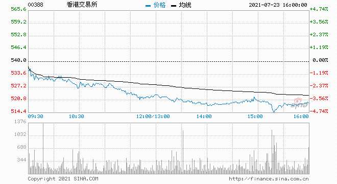 港交所(00388)尾盤跌超4%,截至收盤,跌3.52%,報521港元,成交額37.23億港元。