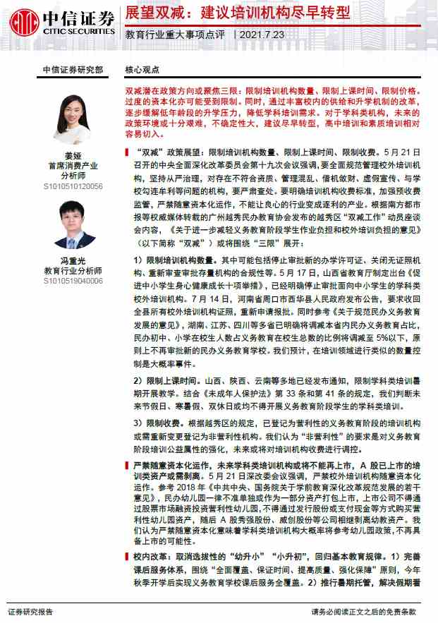 就在教育股暴跌前,中金精準(zhǔn)呼吁股民規(guī)避風(fēng)險(xiǎn)。昨日早間,【中金公司(601995)、股吧】發(fā)布研報(bào)稱,5月21日,中央全面深化改革委員會(huì)第十九次會(huì)議召開,會(huì)議審議通過了《關(guān)于進(jìn)一步減輕義務(wù)教育階段學(xué)生作業(yè)負(fù)擔(dān)和校外培訓(xùn)負(fù)擔(dān)的意見》。預(yù)計(jì)“雙減”政策后續(xù)將成文發(fā)布。此次教培行業(yè)的規(guī)范管理嚴(yán)格程度史無(wú)前例。