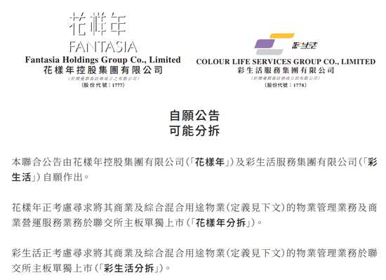 花樣年、彩生活聯(lián)合公告,花樣年正考慮尋求將其商業(yè)及綜合混合用途物業(yè)的物業(yè)管理業(yè)務(wù)及商業(yè)營運服務(wù)業(yè)務(wù)于聯(lián)交所主板單獨上市(「花樣年分拆」)。 彩生活正考慮尋求將其商業(yè)及綜合混合用途物業(yè)的物業(yè)管理業(yè)務(wù)于聯(lián) 交所主板單獨上市(「彩生活分拆」)。