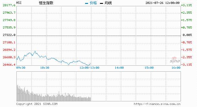 港股主要指數(shù)下跌,恒指低開低走,午間收跌2.9%,國指跌3.6%。