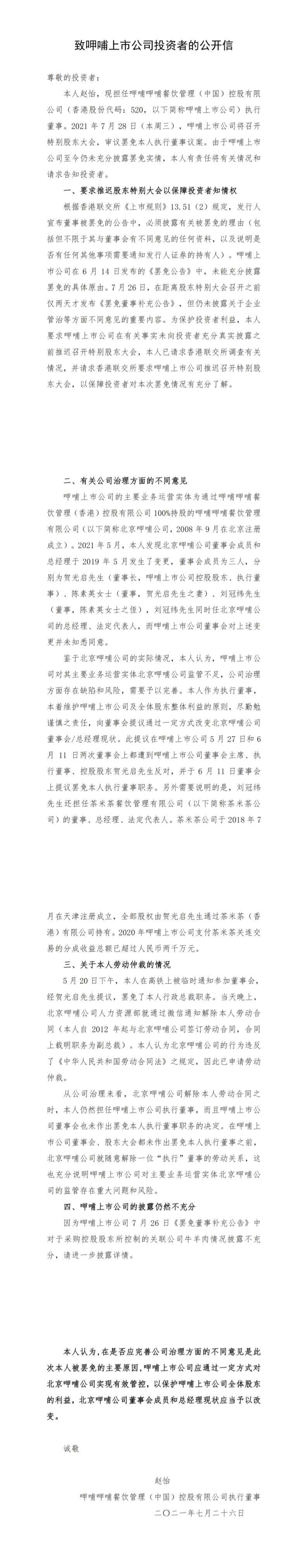 摘要: 7月26日消息,今日,呷哺呷哺集團(tuán)前CEO趙怡發(fā)布《致呷哺呷哺上市公司投資者公開信》。趙怡稱,其現(xiàn)在擔(dān)任呷哺呷哺執(zhí)行董事,7月28日,呷哺上市公司將召開特別股東大會(huì),審議罷免其執(zhí)行董事議案。