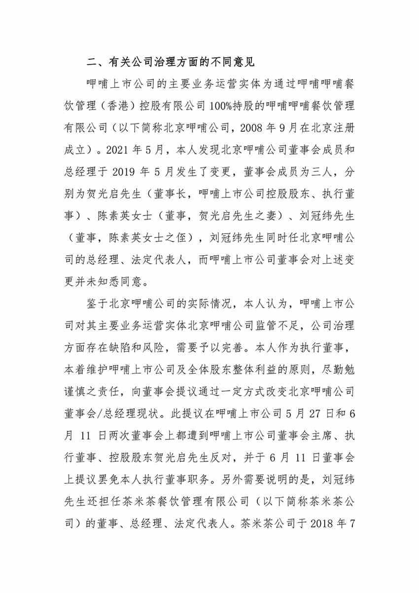 除了指責(zé)呷哺呷哺未及時(shí)向投資者披露公司信息外,趙怡還對(duì)公司治理提出了不同意見(jiàn),稱上市公司對(duì)于主要業(yè)務(wù)運(yùn)營(yíng)實(shí)體北京呷哺公司監(jiān)管不足,公司治理存在缺陷和風(fēng)險(xiǎn)。此外,趙怡還披露,已根據(jù)《中華人民共和國(guó)勞動(dòng)合同法》 申請(qǐng)了勞動(dòng)仲裁。