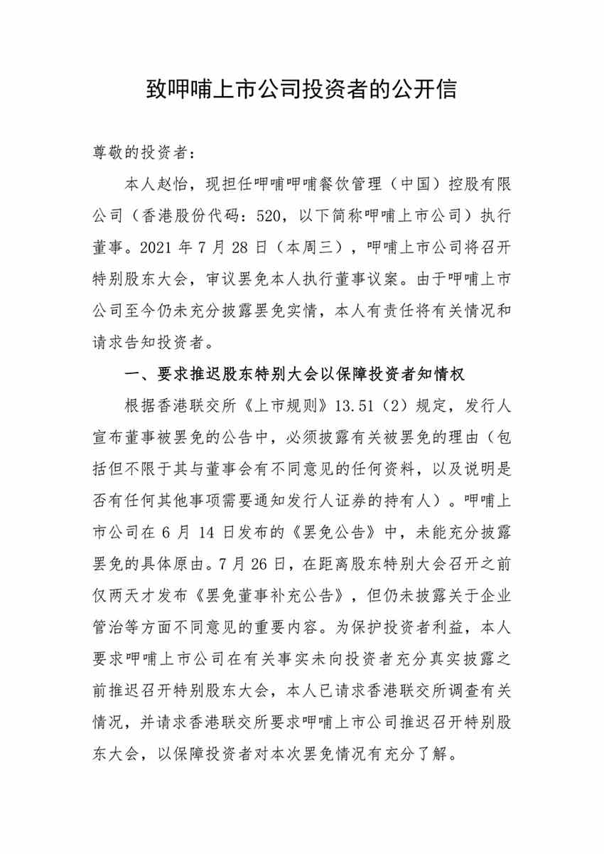 7月26日,呷哺呷哺(0520.HK)原行政總裁趙怡發(fā)布“致呷哺呷哺上市公司投資者公開(kāi)信”,要求上市公司未向投資者充分真實(shí)披露之前,推遲特別股東大會(huì),并請(qǐng)求香港聯(lián)交所調(diào)查有關(guān)情況。