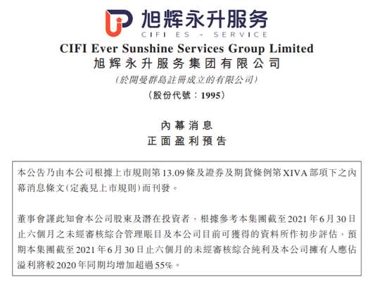 旭輝永升服務(wù)發(fā)布公告,董事會謹此知會本公司股東及潛在投資者,根據(jù)參考本集團截至2021年6月30日 止六個月之未經(jīng)審核綜合管理賬目及本公司目前可獲得的資料所作初步評估,預期本集團截至2021年6月30日止六個月的未經(jīng)審核綜合純利及本公司擁有人應(yīng)占溢利將較2020年同期均增加超過55%。