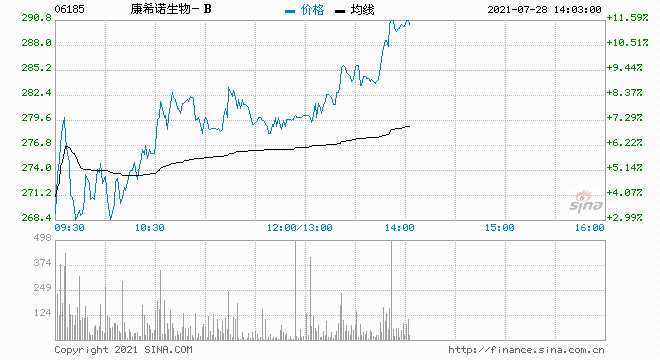康希諾A股一度漲超10%報(bào)564.88元,H股現(xiàn)漲10.59%,報(bào)288.20港元,最新市值1145億人民幣。