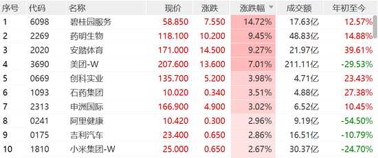 7月28日消息,港股恒指午后漲幅持續(xù)擴大,截至發(fā)稿,恒指漲1.3%,國企指數(shù)漲幅突破2%,恒生科技指數(shù)大漲2.6%。藍籌股方面,碧桂園服務漲近15%,藥明生物、安踏等漲超9%,美團漲幅擴大至7%。