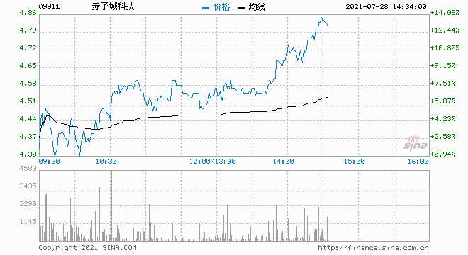 不受政策影響且有業(yè)績(jī)支撐的赤子城科技(9911.HK)午后明顯拉升,大漲13.62%,報(bào)4.84港元,市值48.3億港元。