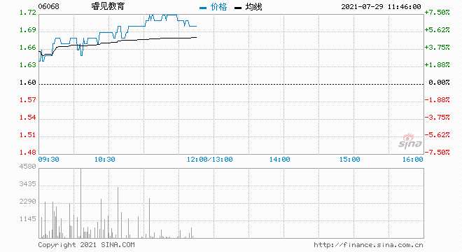 隔夜中概教育股集體大漲,帶動今日港股市場教育股集體走強。其中,睿見教育(6068.HK)漲6.86%,報1.71港元,為連續(xù)第二日反彈,市值37億港元。