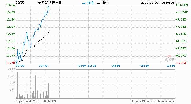 聯(lián)易融科技(9959.HK)大幅拉升漲12%,報(bào)13.1港元,暫成交2699萬(wàn)港元,總市值超300億港元。