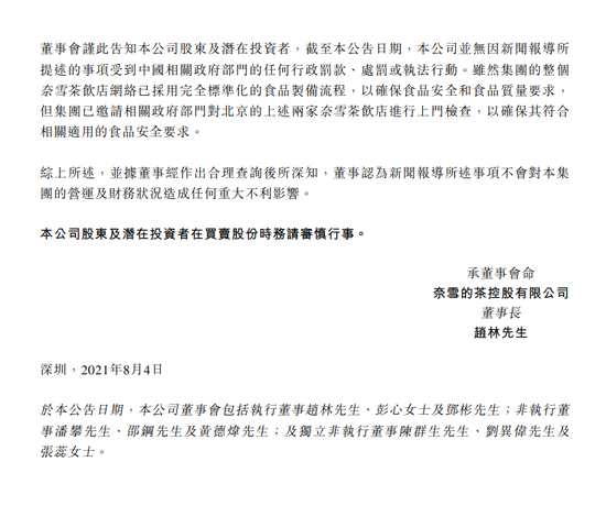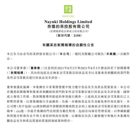 8月4日,奈雪的茶在港交所公告,董事會謹(jǐn)此告知本公司股東及潛在投資者,截至本公告日期,本公司并無因新聞報導(dǎo)所提述的事項(xiàng)受到中國相關(guān)政府部門的任何行政罰款、處罰或執(zhí)法行動。董事認(rèn)為新聞報導(dǎo)所述事項(xiàng)不會對本集團(tuán)的營運(yùn)及財務(wù)狀況造成任何重大不利影響。