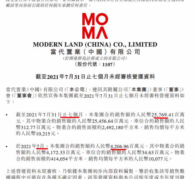 8月4日訊:當(dāng)代置業(yè)(中國)有限公司(簡稱“當(dāng)代置業(yè)”,HK:01107)發(fā)布截至2021年7月31日止七個月未經(jīng)審核營運數(shù)據(jù)顯示,截至2021年7月31日止七個月,集團合約銷售額約為257.69億元,同比增長41.5%。其中物業(yè)合約銷售額約254.57億元,車位合約銷售額約3.13億元。物業(yè)合約銷售面積約249.22萬平方米,銷售均價每平方米約10215元。