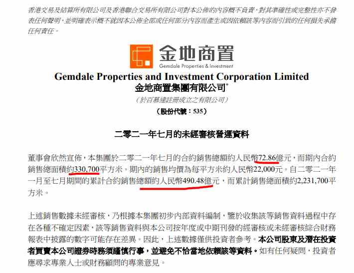 摘要: 8月5日訊:金地商置集團有限公司(簡稱“金地商置”,HK:0535)發(fā)布2021年7月未經(jīng)審核營運資料顯示,2021年1-7月期間公司的累計合約銷售總額約490.48億元,同比增長33.2%,