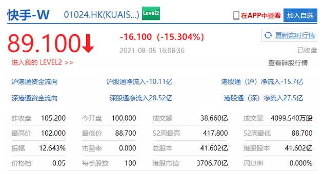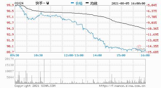 新浪科技訊 8月5日下午消息,港股收盤,快手跌15.304%,報每股89.1港元,市值3706.7億港元。