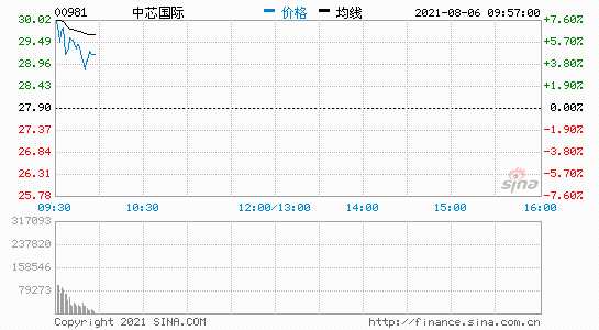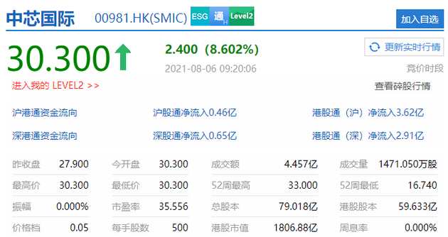 新浪科技訊 8月6日上午消息,港股中芯國際開漲8.6%,報(bào)每股30.3港元,總市值1806.88億港元。