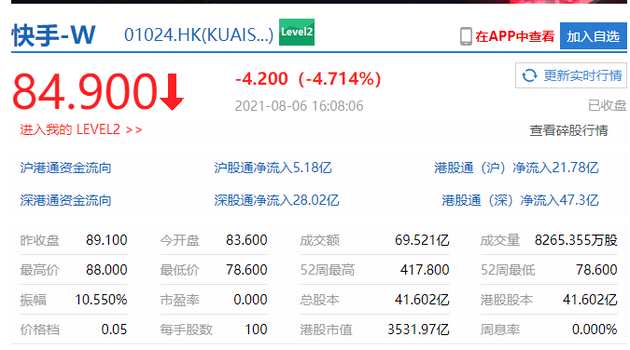 新浪科技訊 8月6日下午消息,港股收盤,快手跌4.714%,報每股84.9港元,市值3531.97億港元,較昨日收盤市值蒸發(fā)175億港元。